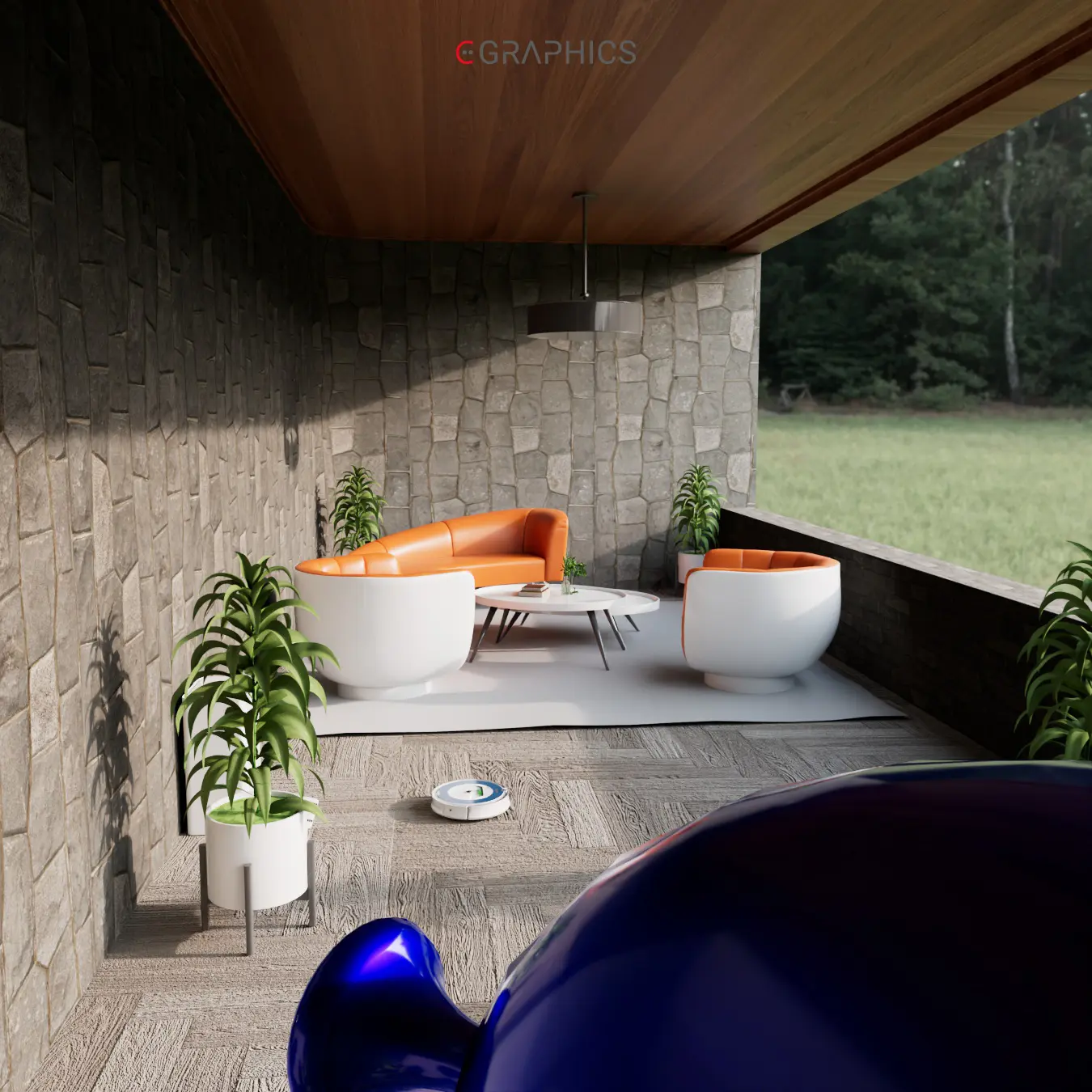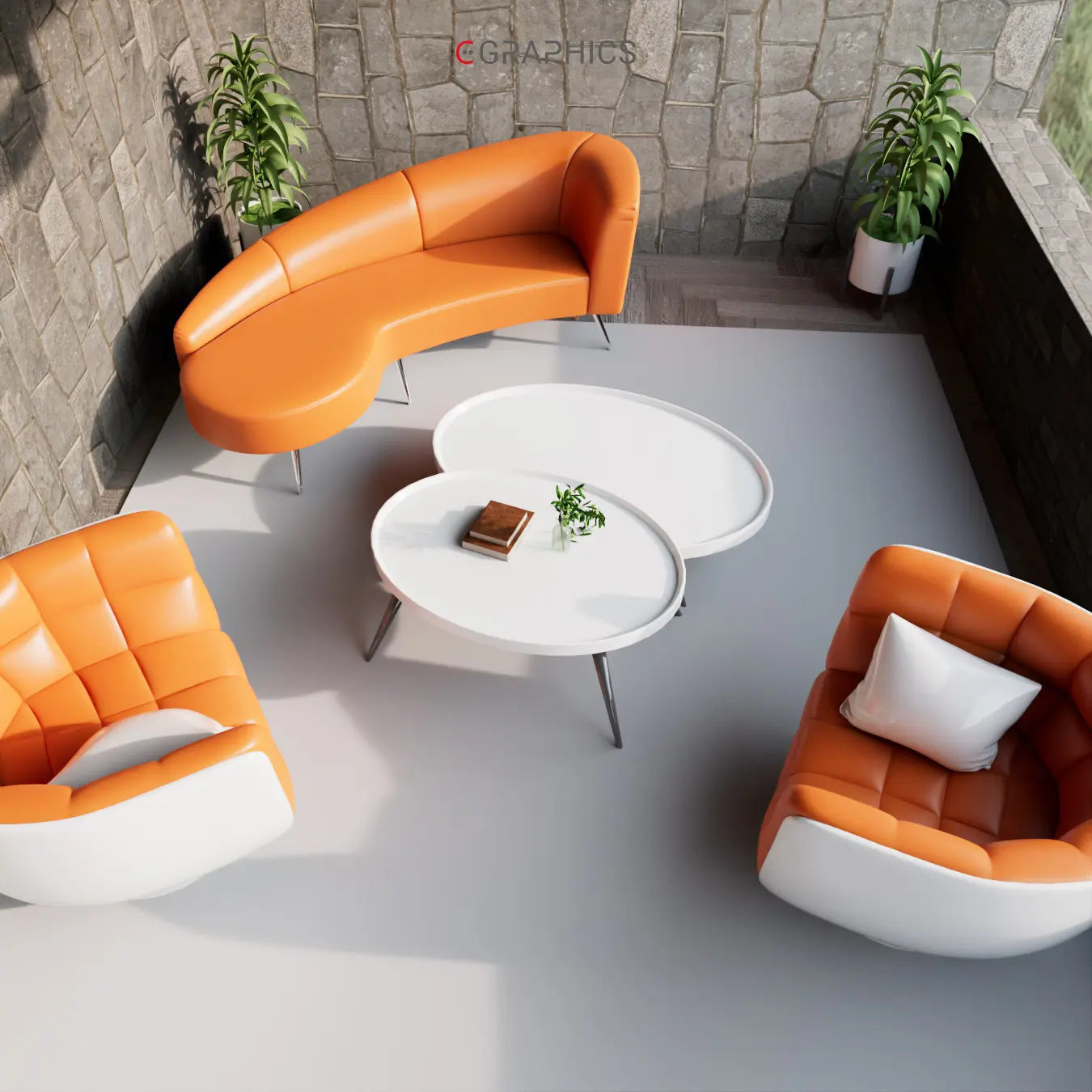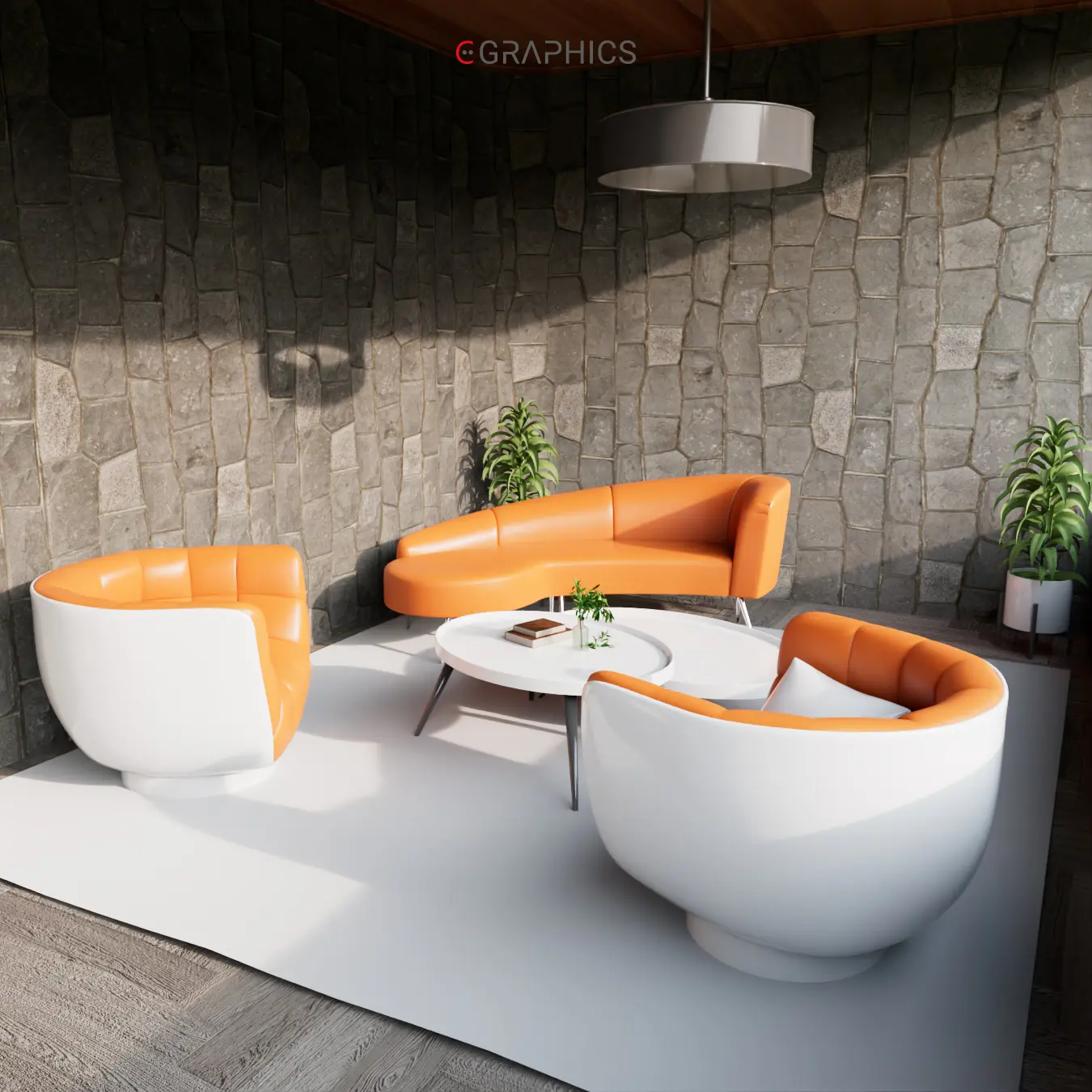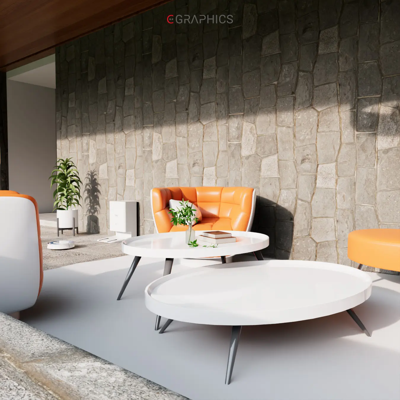 Découvrez ce rendu 3D photo-réaliste : un patio moderne et chaleureux. Ses fauteuils courbés bicolores allient confort et esthétisme contemporain. Le mur en pierre et le jeu de lumière naturelle subliment cette création architecturale unique, parfaite pour se détendre.