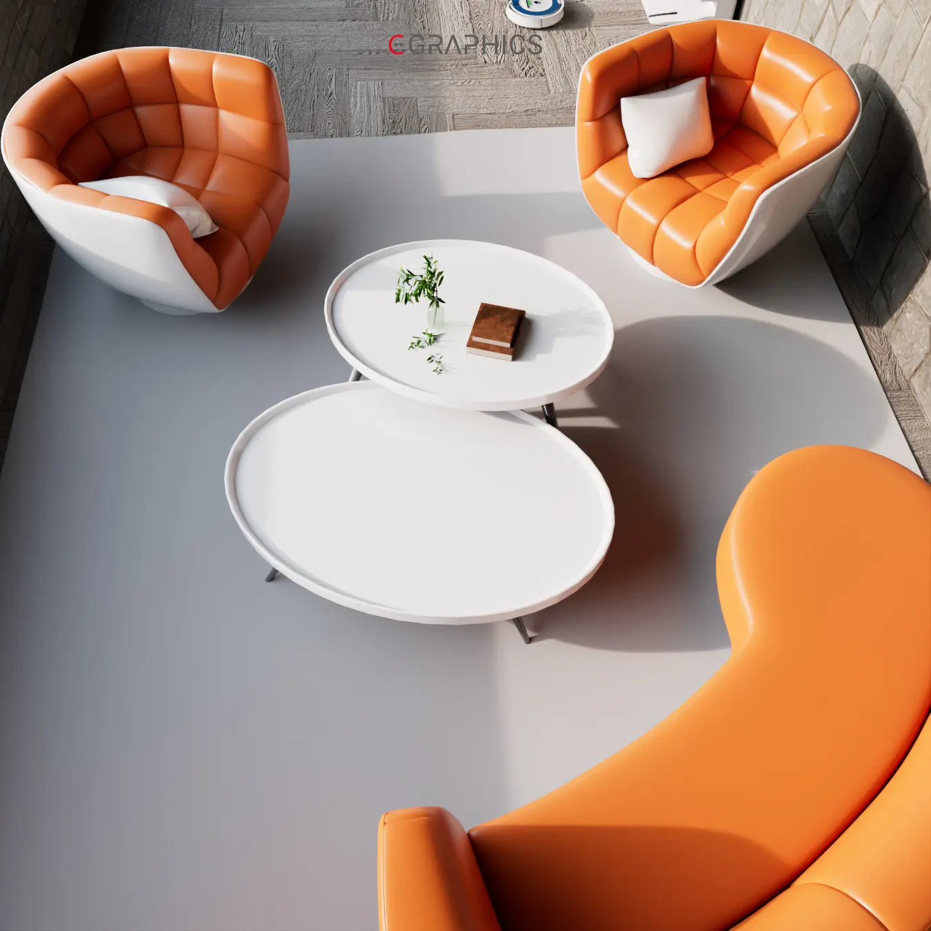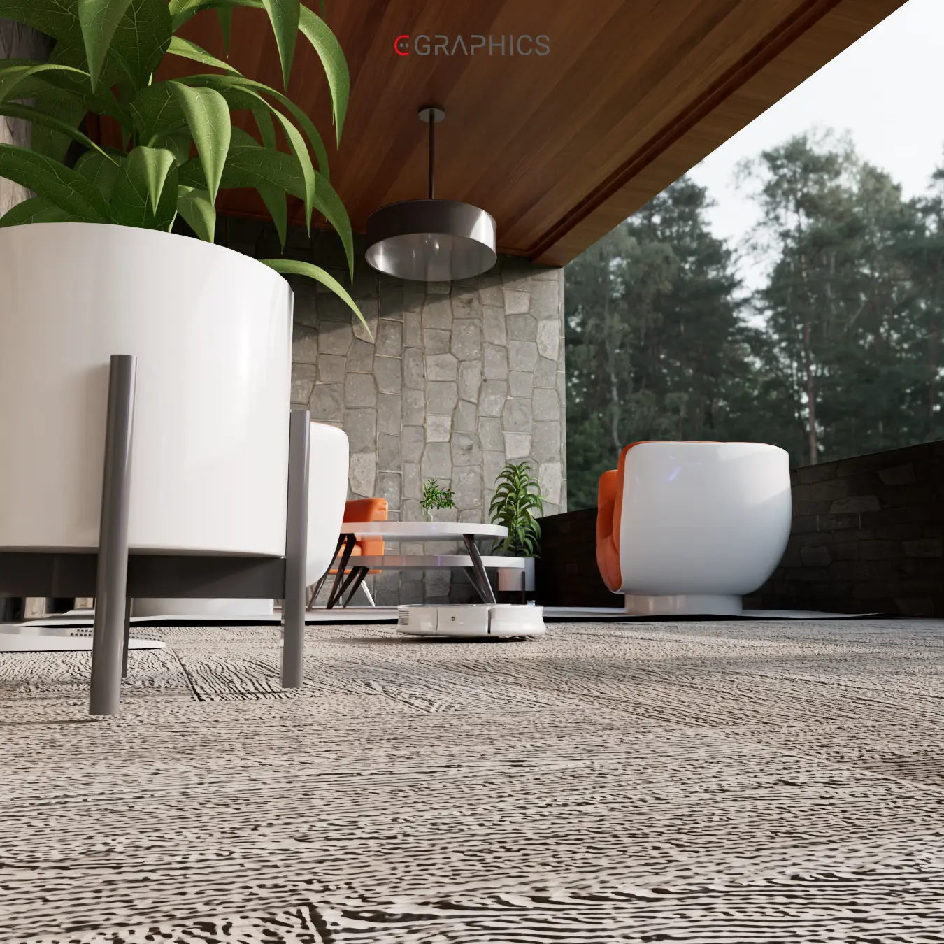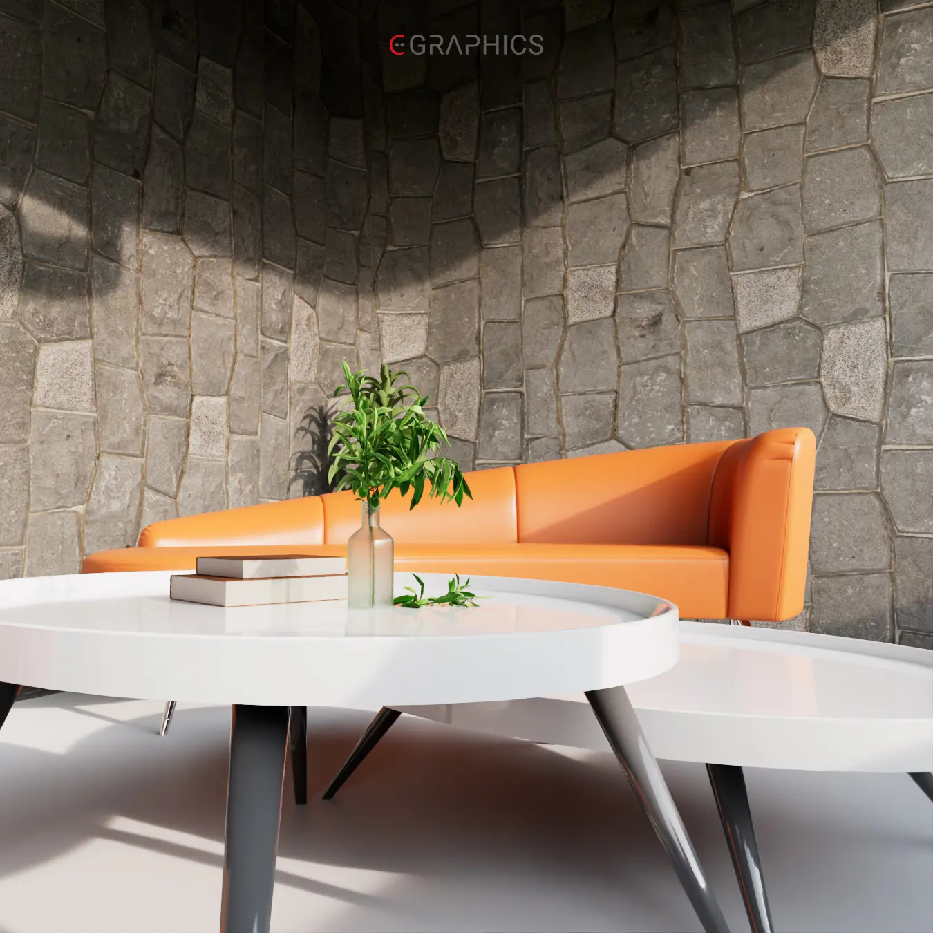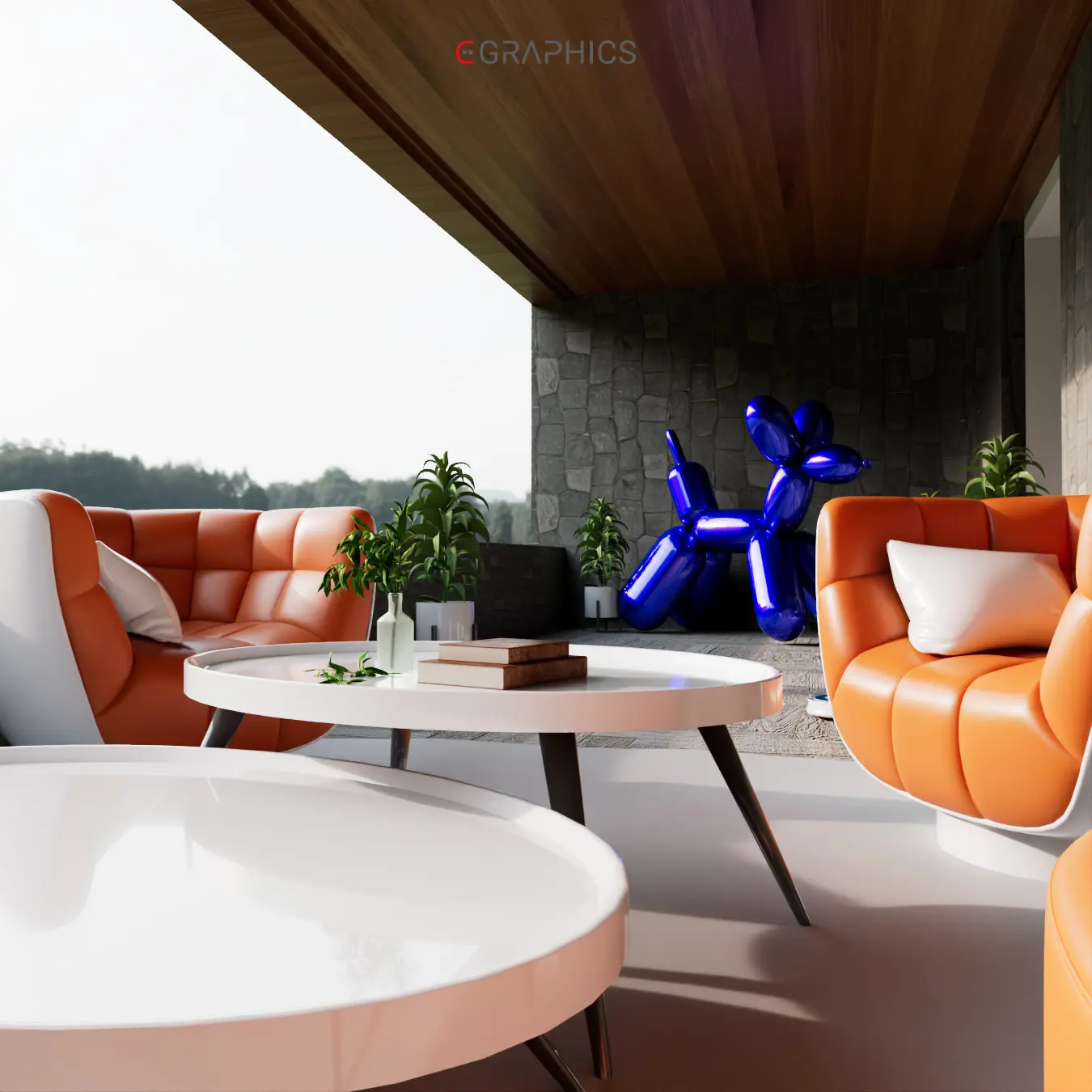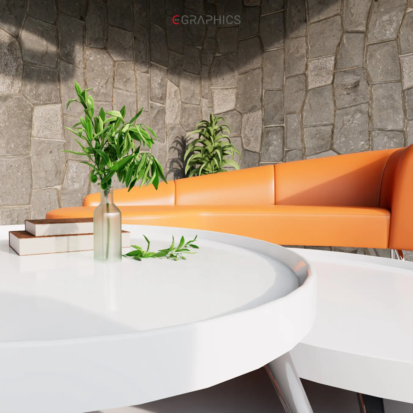 Découvrez ce rendu 3D photo-réaliste : un patio moderne et chaleureux. Ses fauteuils courbés bicolores allient confort et esthétisme contemporain. Le mur en pierre et le jeu de lumière naturelle subliment cette création architecturale unique, parfaite pour se détendre.